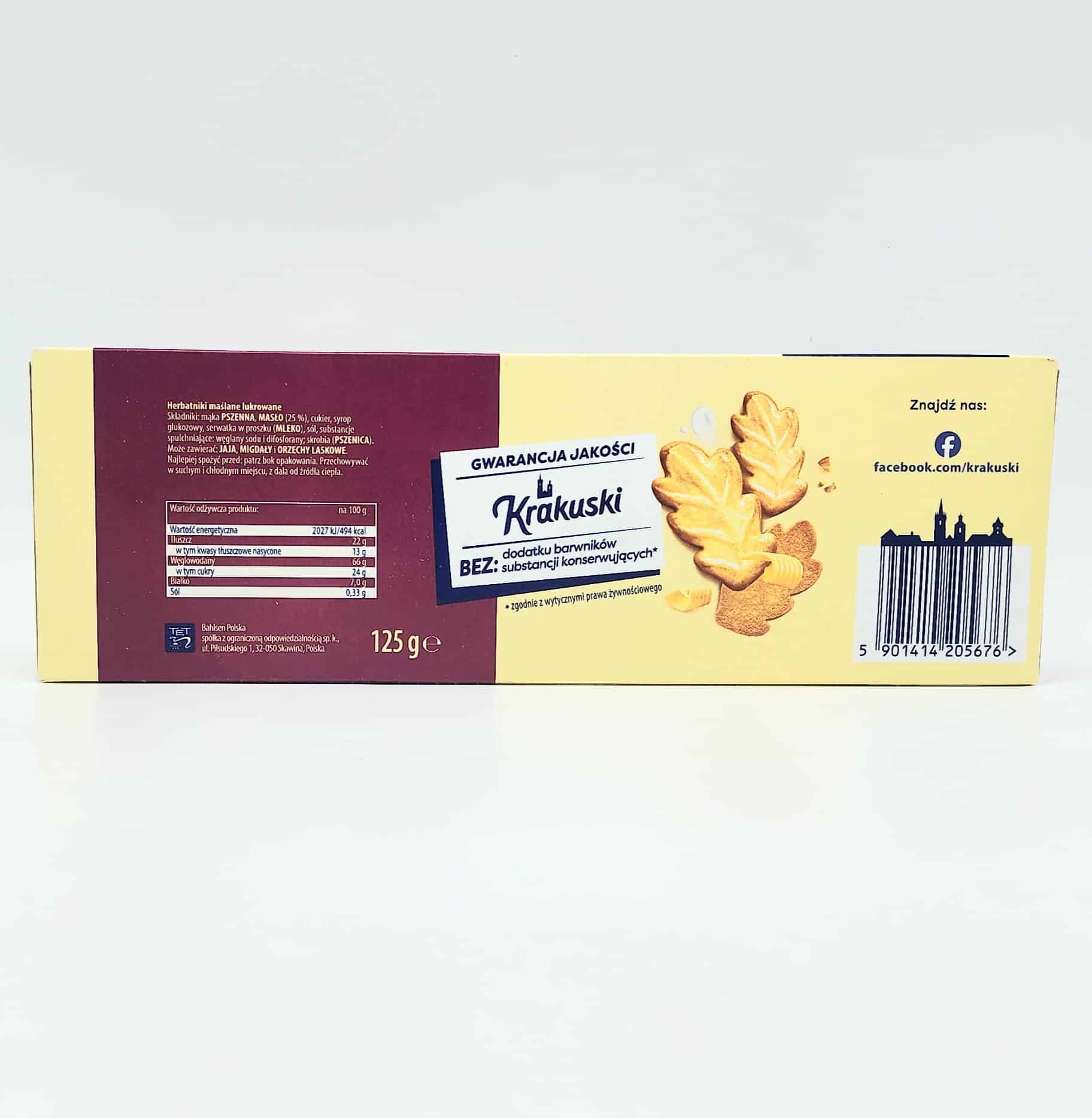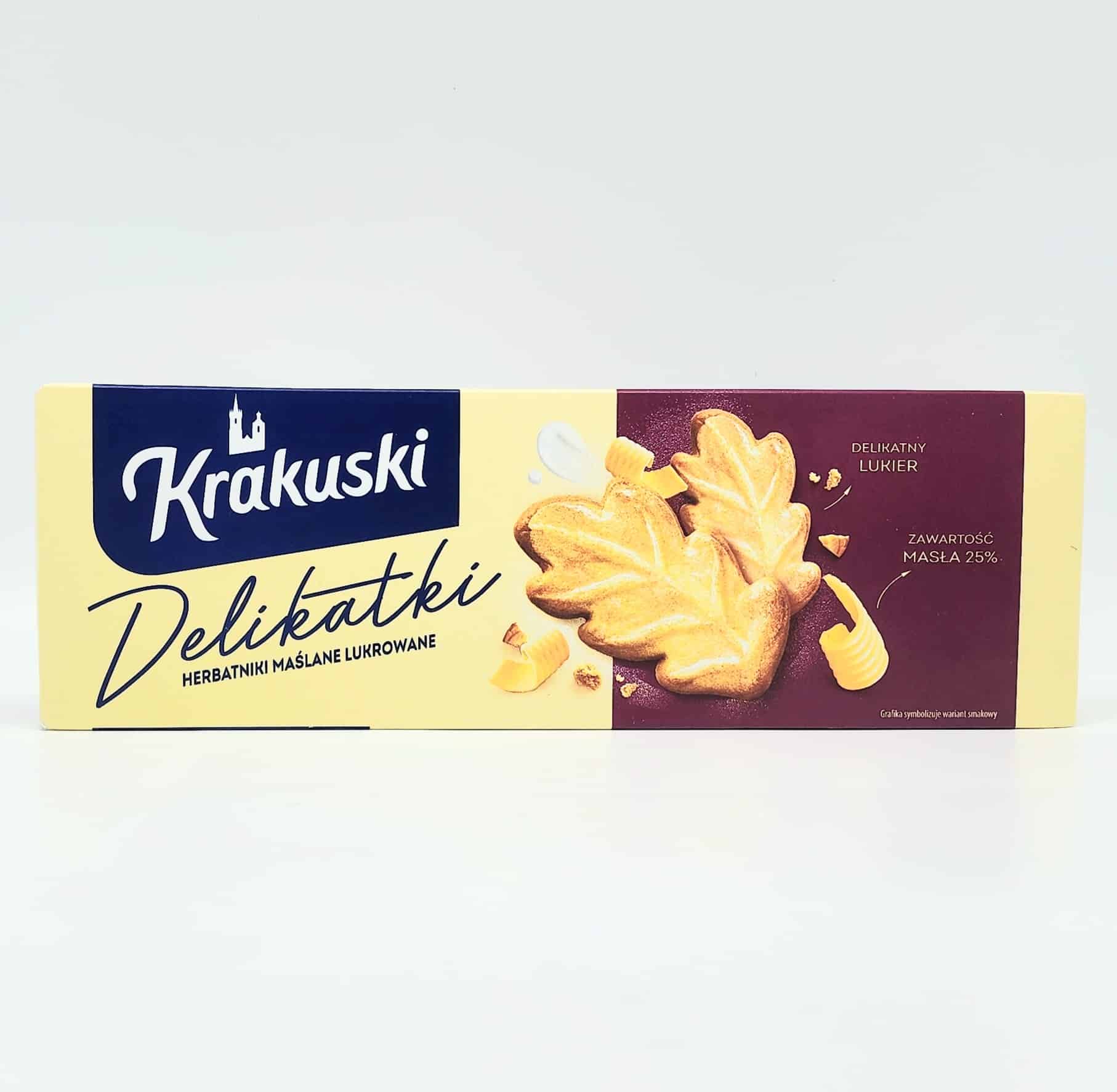 Krakuski Delikatki – Butter Biscuits with Icing 125g Delicate butter biscuits enhanced with icing – light, sweet, perfect with coffee or as a subtle snack. A perfect combination of classic taste and decorative finish.