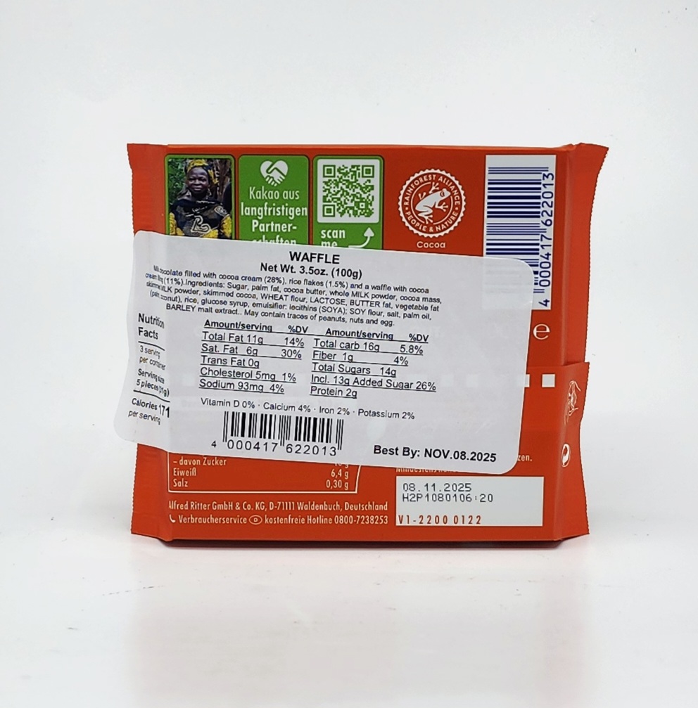 RITTER SPORT milk chocolate Waffel 100g Milk chocolate filled with cocoa cream (28%), rice flakes (1.5%) and a wafer with cocoa cream filling (11%)