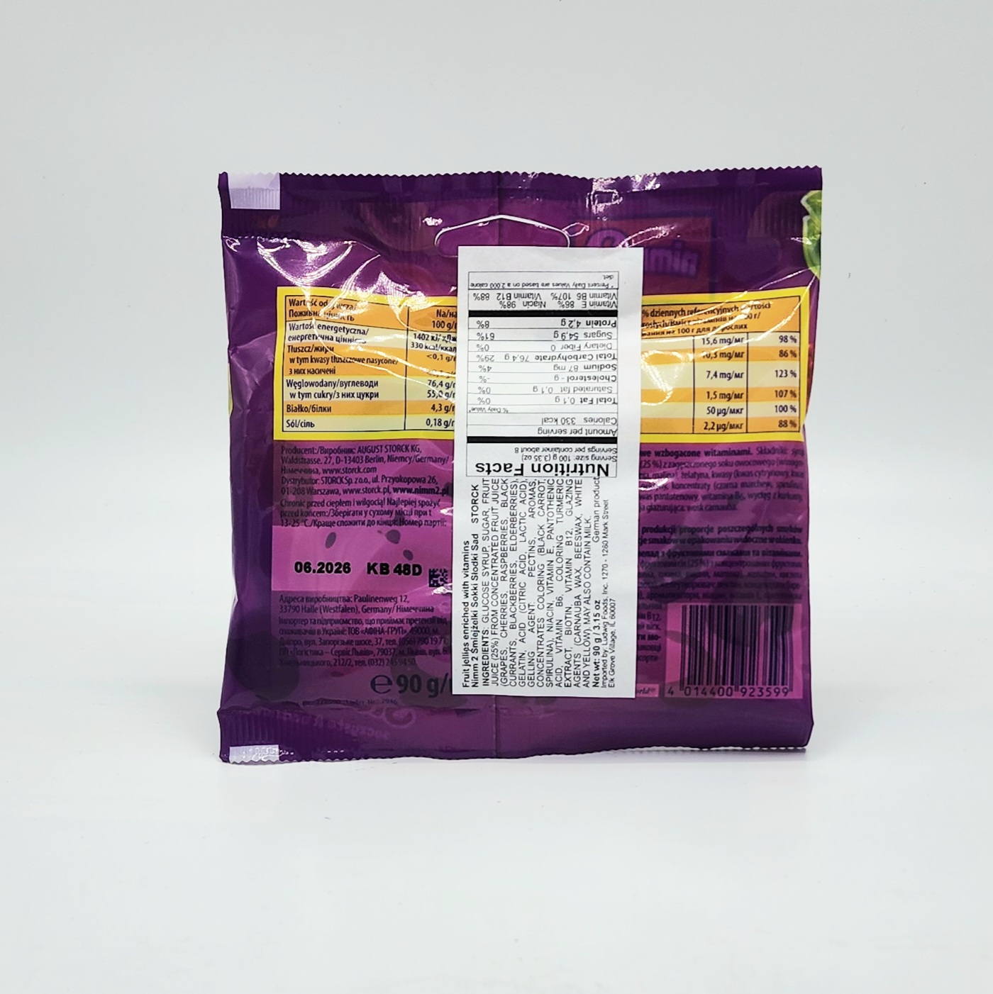 Glucose syrup, sugar, fruit juice (25%) from concentrated fruit juice (grapes, cherries, raspberries, blackcurrants, blackberries, elderberries), gelatin, acid (citric acid, lactic acid), gelling agent: pectins, flavourings, colouring concentrates (black carrot, spirulina), niacin, vitamin E, pantothenic acid, vitamin B6, colouring turmeric extract, biotin, vitamin B12, glazing agents (carnauba wax, beeswax, white and yellow). May also contain milk.