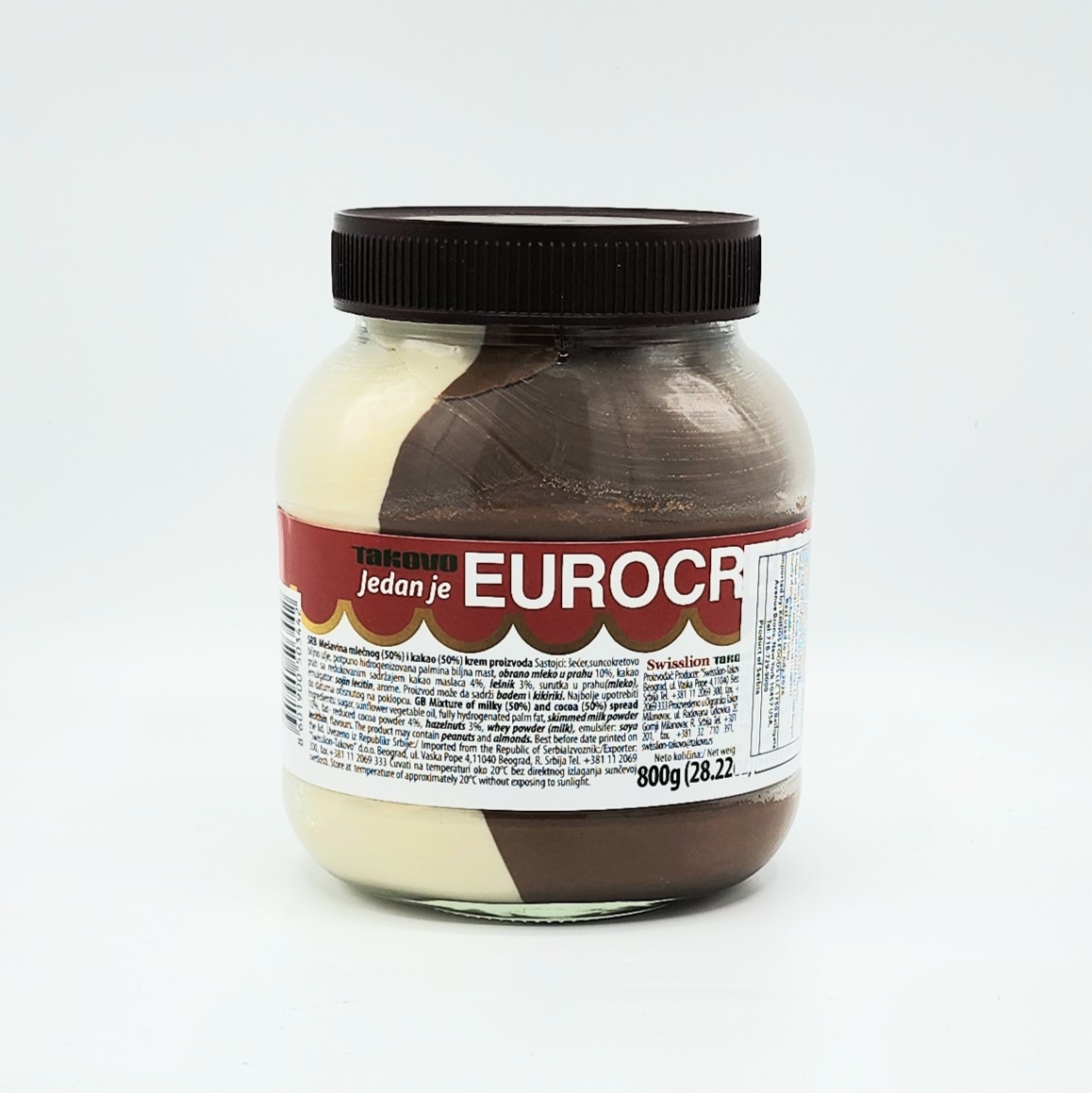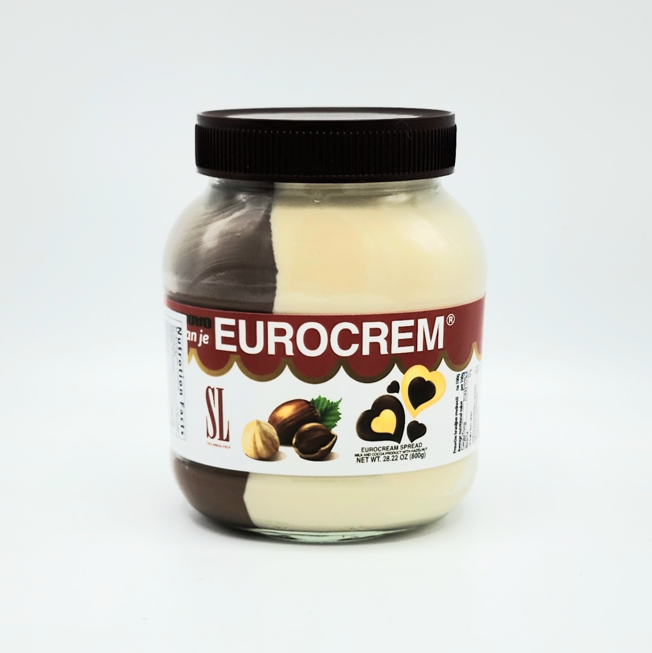 Eurocrem is a bi-colored brown and white hazelnut-and-vanilla-flavored sweet milk chocolate spread. It is an exceptionally smooth and satisfying hazelnut cream ready to be added as a special treat to your snack. Spread it over toast, pancakes, wafers or cookies.